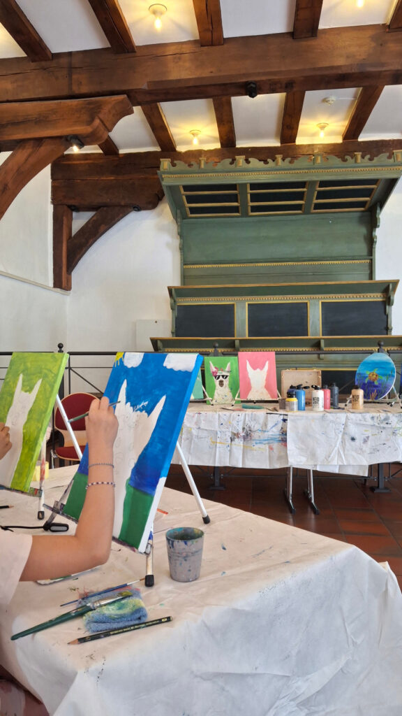 in den Sommerferien gestalte ich jedes Jahr mehrere bunte Nachmittage, an denen interessierte Kinder und Teenager sich in der Acrylmalerei ausprobieren dürfen! Die Veranstaltungsreihe ist (bis auf eine Materialkostenpauschale) kostenfrei! 2025 durften wir mit der Hohen Schule einen ganz besonderen Malort genießen.