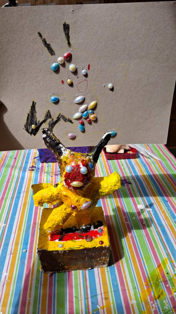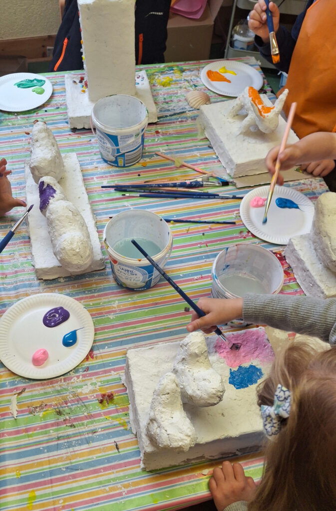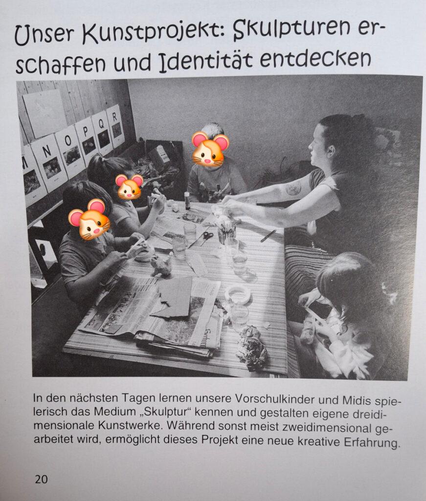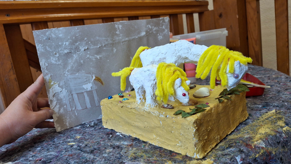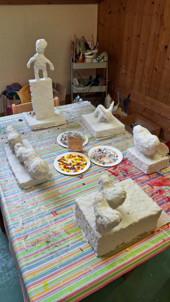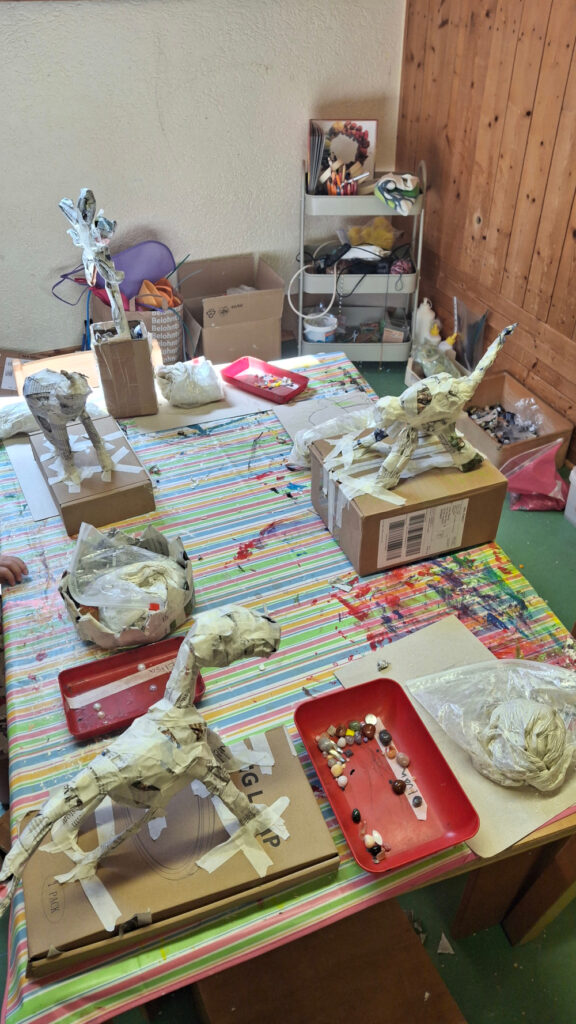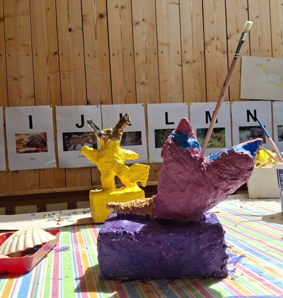 ein anspruchsvolles Kunstprojekt für Vorschulkinder. Die Kinder entwerfen skizzenhaft Ideen für ihre phantasievollen Plastiken. Diese werden dann zunächst grob aus Papier, Pappe, Draht und Klebeband vorgeformt und in einem zweiten Arbeitsschritt mit Plastiform (einer Masse aus Holzmehl, Leim und Wasser) überzogen. nach dem Trockenprozess sind die Plastiken in etwa so hart wie solides Holz und können bemalt, beklebt und lackiert werden. Es sind viele kreative Kunstwerke entstanden und die Kinder gingen mit gestärktem Selbstbewusstsein aus dem Projekt!